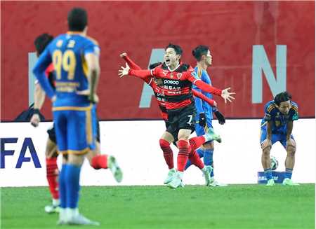 但有着“杯赛dna”的浦项铁人怎么会轻易认输,就像去年韩国杯逆转全北现代汽车一样。浦项铁人的球员又在落后的情况下展现出了“顽强”的斗志,下半场开场他们不断试利用对手的边路漏洞多次突破,并且制造了几次突破后射门的机会,但雷声大雨点小,丝毫无法威胁蔚山的球门。关键时刻,时势造英雄!3年前在足协杯决赛一战成名的郑在熙扮演了英雄,他在第69分钟外围远射,皮球经过折射后飞入了蔚山的球门,1-1!浦项扳平了比分。首尔世界杯竞技场的浦项球迷沸腾了,他们似乎看到了一年前的剧本!