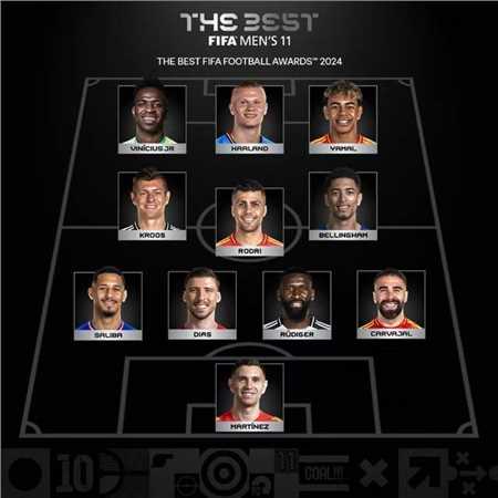 fifa年度颁奖典礼,官方公布了fifa2024年度最佳阵容(433),具体情况如下:
