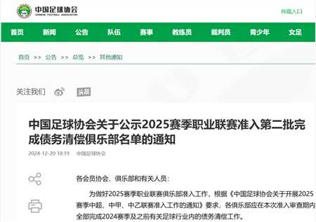 12月20日傍晚,中国足协官方公布第二批完成债务清偿俱乐部名单。名单显示,三级职业联赛所有球队均完成了债务清偿。
