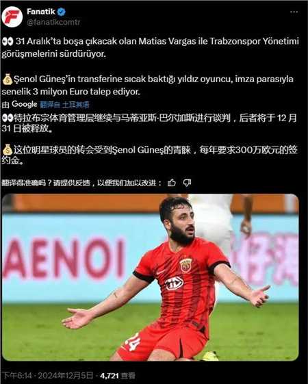 然而,巴尔加斯似乎并不想继续留在中超踢球。此前便有消息称,土超球队特拉布宗体育对他很感兴趣,主帅居内什希望巴尔加斯的加盟能够增强球队的边路实力。但巴尔加斯狮子大开口,张口就要了一份年薪350万欧元的大合同。