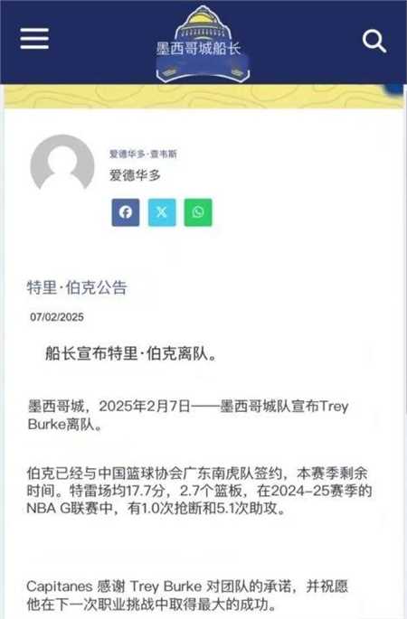 在这两天时间里,外援特雷伯克加盟广东男篮的消息引发了球迷的关注和热议。就在日前,特雷伯克效力墨西哥城队长发布公告,宣布特雷伯克离队,并表示他会加盟cba联赛的广东男篮效力(下图是译文截图)。也就是说,特雷伯克即将启程来华,很快就能和广东男篮会合。